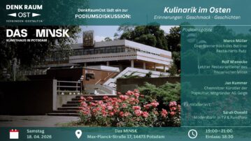 Ein weiteres Mal konnten wir in einer Podiumsdiskussion mit unseren Gästen und Zuhörern über die Vor- und Nachteile, vor allem aber die Vorurteile des Ostens austauschen. Statt Ostalgie, gab es reichlich Information und Unterhaltung für sowohl ost- als auch westdeutsche Zuhörer*innen. Veranstaltungsort war hierfür, passend zum Thema „Kulinarik“, das Kunsthaus MINSK in Potsdam, welches von 1977 bis in die 90-er Jahre als renommiertes Restaurant mit idyllischer Terrasse, für Treffpunkt und Ausflugsziel vieler Bürger stand. Unsere Podiumsgäste waren deshalb keine geringeren als der ehemals und letzte Restaurantchef des MINSK, Rolf Wienecke, der renommierte 3-Sterne-Koch Marco Müller und Mitbegründer der AG Geige sowie beitragender Künstler der Popkultur Jan Kummer.